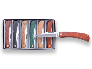 7. Kit de 6 navajas JKR, mango de madera en diferentes colores, hoja de acero inox de 7,7 cm, largo total 17,2 cm, JKR543