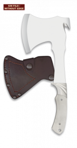 2. Hacha Fornitura de acero inox y virola de acero, incluye skiner, largo total de 29 cm, con funda de piel