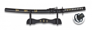 1. Conjunto Katanas Decorativas Estilo Dragón Color Negro, con Hoja de acero de Carbono. Incluye Peana  31515-NE