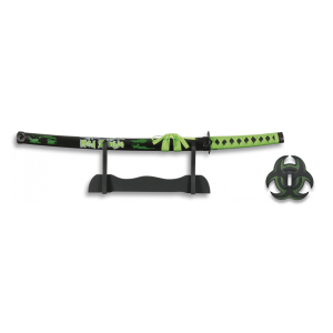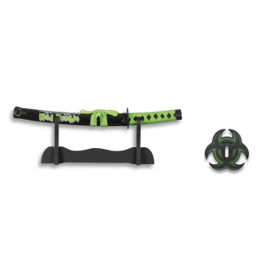 9. Katana Mad Zombie con peana, hoja de 29 cm de acero de carbono, tamaño total 53 cm, color verde y negro, 32148