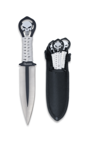 43. Set de 3 cuchillos lanzadores Calavera, hoja de acero inox, tamaño total de 17 cm, mango encordado