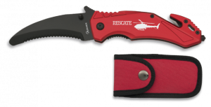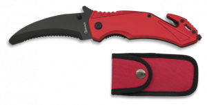 19. Navaja Táctica de Seguridad Roja Martinez Albainox con mango de aluminio y hoja de acero inoxidable  de 8.5 cm. Incluye clip, punta rompevidrio, cutter cinturón de seguridad y funda de nylon 19982