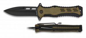 33. Navaja Asistida Martinez Albainox de color Coyote / Negra , sistema FOS hoja de acero inox de 9.6 cm, incluye clip y caja a color