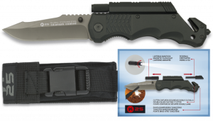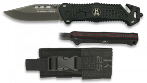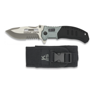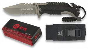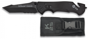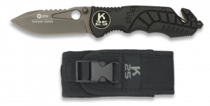 25. Navaja Asistida de Seguridad K25 de color Gris / Negra, con mango recubierto de  goma, Sistema de apertura Fos, Hoja de Acero inox con baño de Titanio de 9,4 cm. Incluye funda de nylon, punta rompevidrio, cutter cinturón doble y caja a color 19654AGR1012 Navaja Asistida de Seguridad K25 de color Gris / Negra, con mango recubierto de  goma, Sistema de apertura Fos, Hoja de Acero inox con baño de Titanio de 9,4 cm. Incluye funda de nylon, punta rompevidrio, cutter cinturón doble y caja a color 19654AGR1012