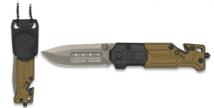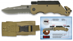 17. Navaja Táctica Rui Pro, Hoja de Acero Inox con Baño de Titanio de 9,5 cm, Mango de Aluminio color Coyote. Incluye Funda de Nylon, Cutter, Linterna y Pedernal 19540