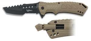 33. Navaja Asistida Martinez Albainox Sistema Fos Coyote, con mango de fibra, hoja de acero inoxidable de 8.6 cm. Incluye clip, cutter cinturón de seguridad, punta rompevidrio 19962-A