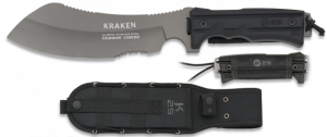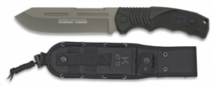 20. Cuchillo Táctico K25 con mango SFL, hoja de acero inoxidable con baño de Titanio de 14 cm, con sistema de apertura rápida y funda de nylon  32163