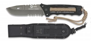 16. Cuchillo Táctico  K25 con mango SFL Encordado color coyote, hoja de acero inoxidable  con baño de Titanio de  12 cm, con funda de nylon 32164