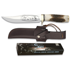 12. Cuchillo deportivo Steel 440, tamaño de 23 cm, virola de acero, mango de asta de ciervo, con funda de piel, 32130