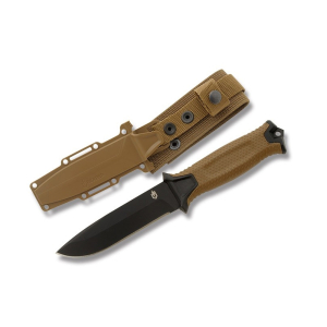 11. Cuchillo Gerber StrongArm Coyote Liso, con revestimiento cerámico negro, largo total 24,8 cm, grosor de 4,8 mm, con funda Kydex, GE30001058