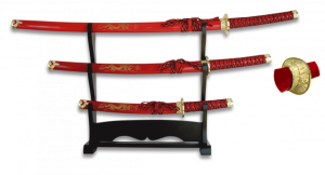 40. Conjunto Katanas Japonesas Motivo Dragón de Color Rojo, Hoja de acero de carbono. Incluye Peana 31515-RO