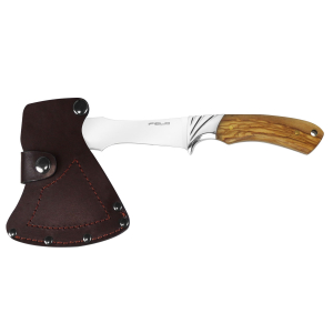 29. Hacha deportiva iField Camper EL29002, 17 cms de hoja de acero inox, tamaño total de 29,5 cm, con funda de piel, mango Olivo,  herramienta de camping para pesca, caza, actividad deportiva